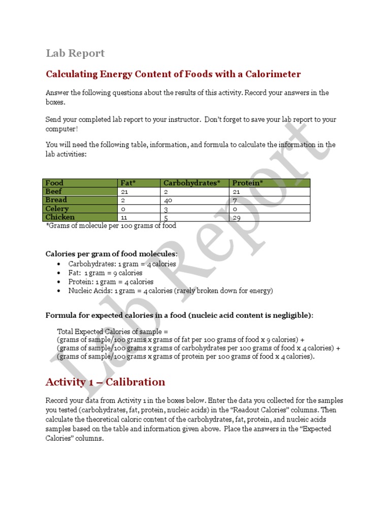 Lab Report Calculating Energy Content of Foods With A Calorimeter